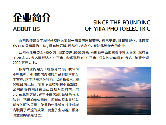 山西怡佳建設工程股份有限公司是一家集高壓輸變電、機電安裝、建筑智能化、建筑亮化、LED 顯示屏為一體,具有跨區(qū)域、網(wǎng)絡化、信息化、智能化等特點的企業(yè)。